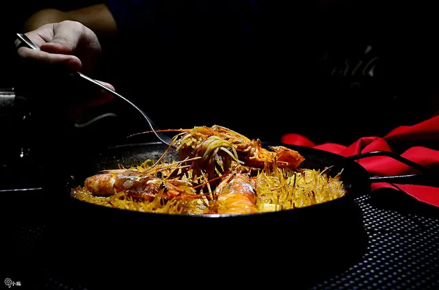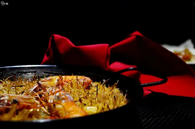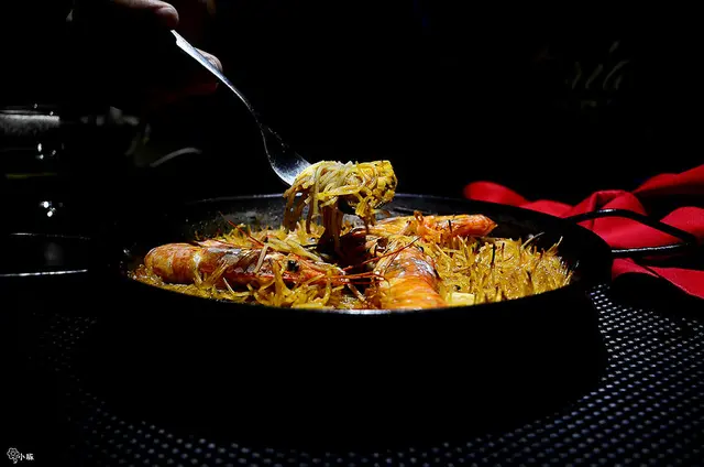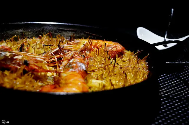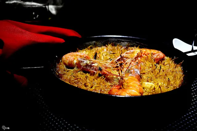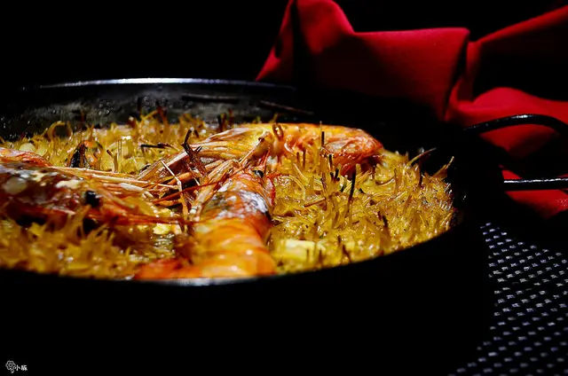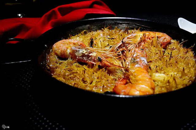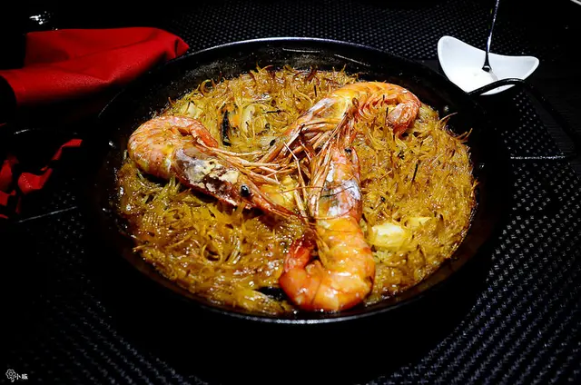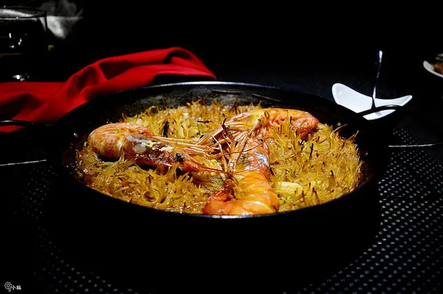 使用短的天使細麵當麵條,食材有番紅花、天使紅蝦、淡菜、蛤蜊和魚塊,