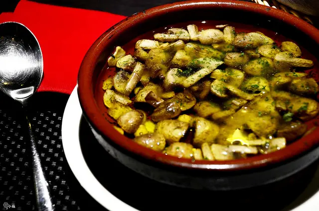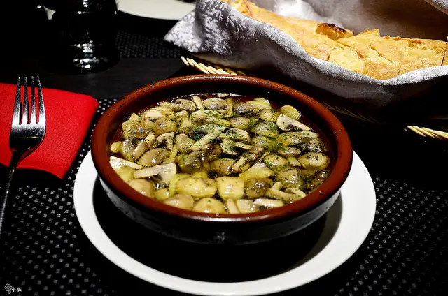 以滾沸橄欖油之姿出場的蒜煮蘑菇,現場看起來好壯觀,