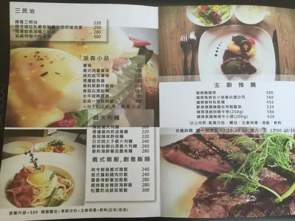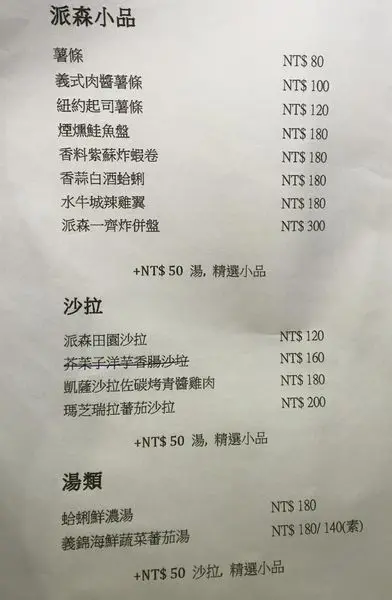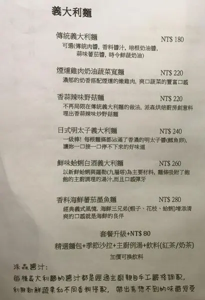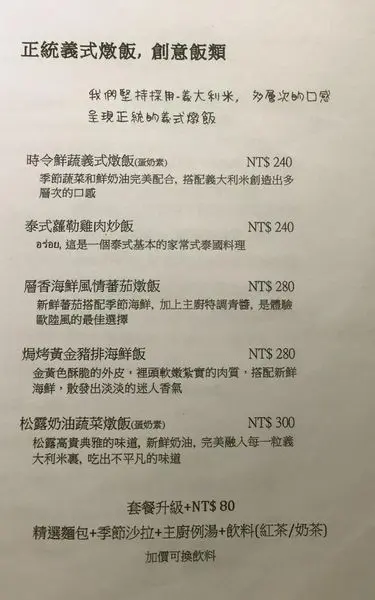(套餐升級+$80,附精選麵包、季節沙拉、主廚例湯、飲料(紅茶/奶茶))