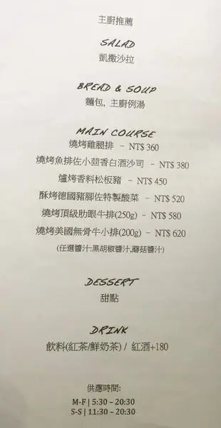 (附凱薩沙拉、麵包、主廚例湯、甜點、飲料)