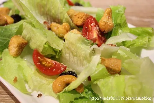 麵包丁、蕃茄、起司粉、葡萄乾分布在新鮮的生菜裡,很香很脆我們很喜歡