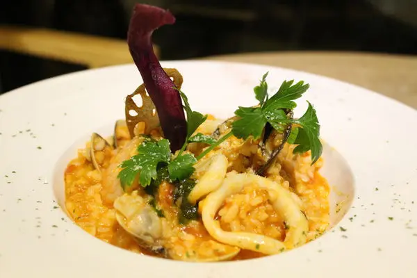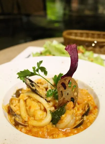 海鮮的部分相當豐富,是盤漁獲量(?)很充足的燉飯,有蛤蠣、蝦仁、花枝還有魚肉!!!!整體的滋味很融洽好吃,令人彷彿徜徉在蕃茄海,以仰式在蕃茄海上邊悠游邊發出銀鈴般的笑聲(什麼畫面?)