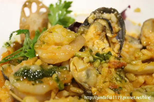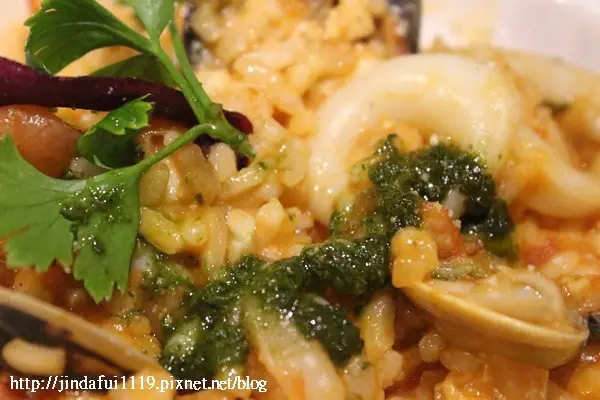除了蕃茄醬以外燉飯上還有加了一點點的青醬,而他們的燉飯是使用義大利米,故是我喜歡的那種稍微硬一點的口感,有種粒粒分明的感覺。