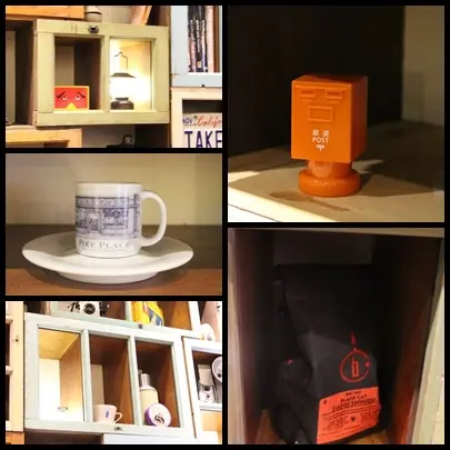 仔細一瞧還有日本的餅乾盒子、日本郵便局的郵筒模型(可惡,想要!)pike place的 starbucks城市杯、我很愛的blue bottle的杯子還有前年我在芝加哥也有買的咖啡豆