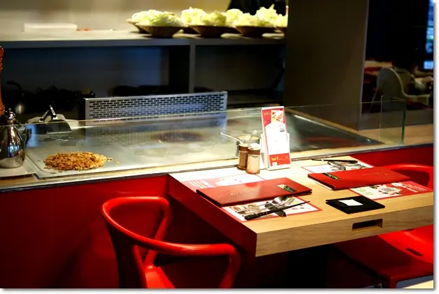 而這次是坐在左邊區域,所有餐點都是在一旁開放式的鐵板煎炒後裝盤,再由服務人員送至座位