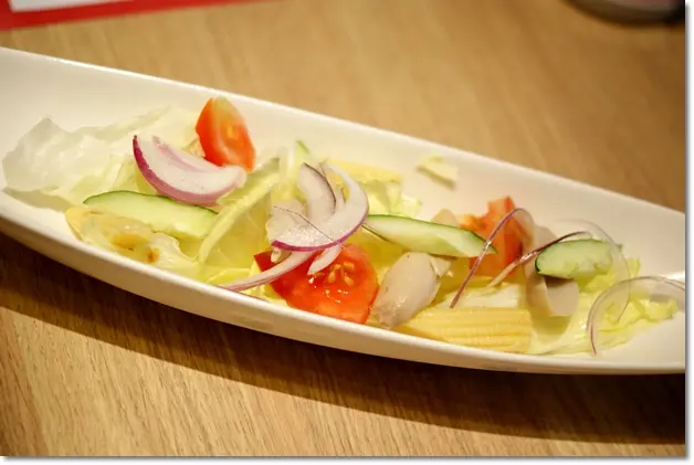 沙拉裡有多種在地蔬果:洋蔥、蕃茄、小黃瓜、小玉米、杏鮑菇、生菜...etc,通通都蠻新鮮的