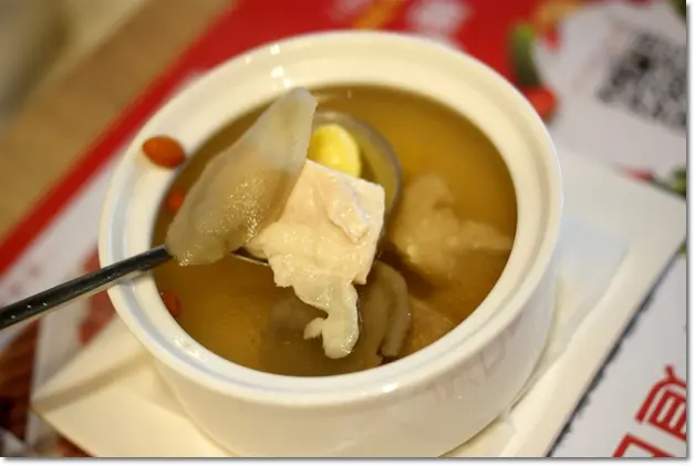 以新鮮的銀杏、牛蒡、枸杞搭配雞腿肉燜燉,喝起來牛蒡的香味完全釋放到雞湯中