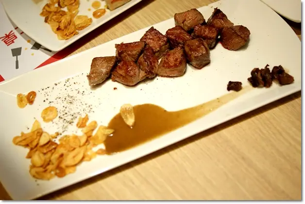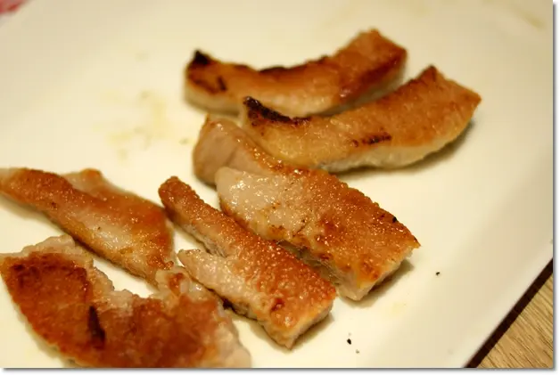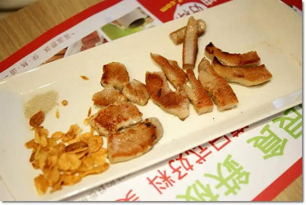 豬肉的肉質帶點咬勁,在以高溫鉄板煎至表面香酥金黃後,沾上芥末胡椒鹽及蒜片一起吃,真不賴