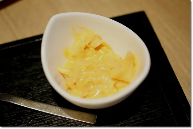 這是由天然南瓜泥及大蒜入味的黃金泡菜,吃起來像在團購界也頗紅的「小潘芽片泡菜」,好吃