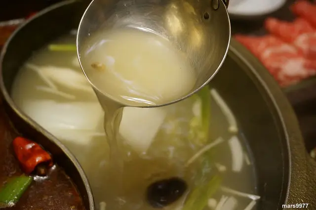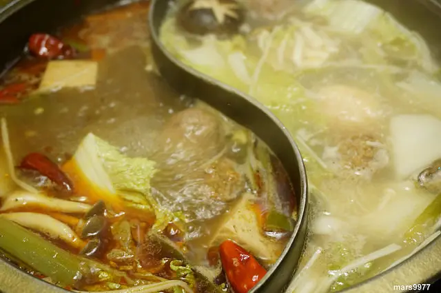 跟著以牛、豬、雞骨和多種蔬果慢火精熬成就的上湯而成的紅鍋