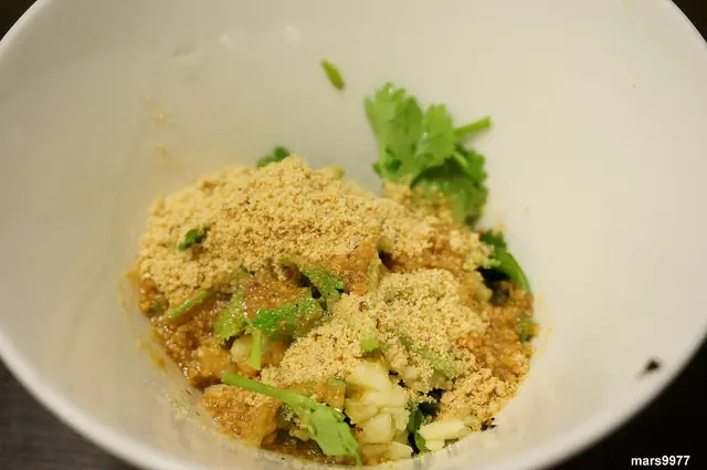 有香菜、花生粉、豆瓣醬等組合,再跟魚麵一起才能混出特殊的滋味