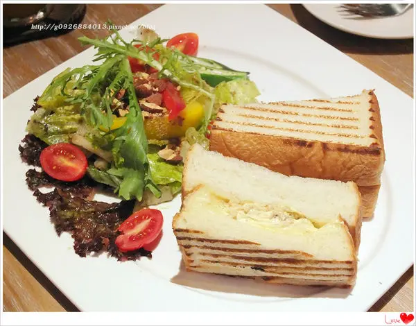 鬆軟吐司+雞肉+奶油乳酪+法式香草料+時蔬沙拉