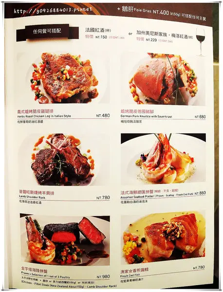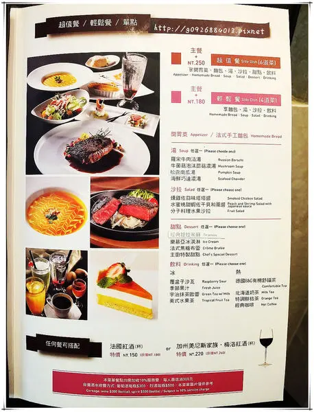 主餐+250元 有(開胃菜、麵包、湯、沙拉、甜點、飲料)