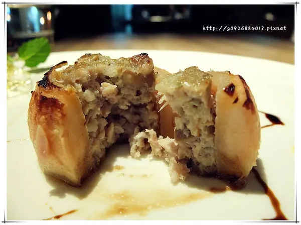 外層是烤過的蜜蘋果,內層是飽滿紮實的雞絞肉