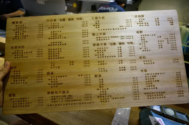 ▲原來實際上是特別訂製的木質菜單,一方面充滿特色一方面看起來就是無敵~哈哈。更是與店外所擺放的是相同的,上面更註明了店家豐富且多元的菜色部份包含沙拉、湯物、刺身、野菜、米食、煮物、上選極選的牛、豬、雞羊肉類,當然更有多樣的海鮮類來滿足大家的胃。