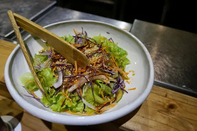 搭配以美生菜、紅蘿蔔、洋蔥等的沙拉,淋上酸甜適中的醬汁配上芝蔴的提味,相當的清爽開味,適中的份量讓人在點喚醒味蕾後更加期待後續的各項食材了。