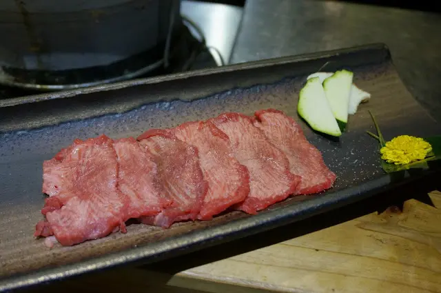 第一道烤好的牛舌,烤至適中的呈現出來的色澤與肉感,都讓人口水直流了。店家更建議在第一次品嚐時,不妨先試看看原味不搭配沾醬的部份,去享受原味所帶來的肉質風味,果然在第一口入口後,感受到的是牛舌的嫩與咬勁,相當厚度的牛舌更是提供了口感上豐富的滋受,而炭火所烤出來的味道更是包覆著牛舌讓嫩香嚼勁組合起來,超滿足的。因為還蠻喜歡吃牛舌,更是覺得這邊的牛舌的厚度與嫩度的表現十分利害說。