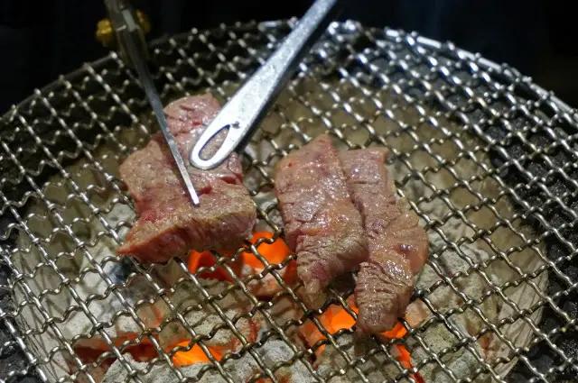 ▲接著就上網架來刷烤了,為什麼說是刷烤呢?因為店家所採用的是透過肉品本身所蘊含的油脂來作為與網架的接觸,而不選用牛油等油脂,反而更保存了肉品的原味與統一性,再來透過先上一手的刷的方式,透過溫度來將油脂逼出來到網上,再放置在其中透過爐火的溫度來將肉品烤至成熟。不過這樣的話,換網的頻率就會較高些,畢竟要維持無敵就要讓網上保持乾淨才能烤出風味極佳的燒肉。