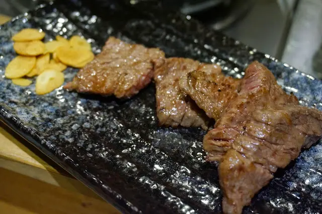 ▲選用等級較高的牛肉同樣可以依熟度來調整品嚐,但這次由專人來服務處理當然就交由其來安排到最佳最適宜的狀態,最後呈現出來就是這樣肉質分明相當美好的牛排,同樣搭配上蒜片的點綴。