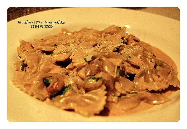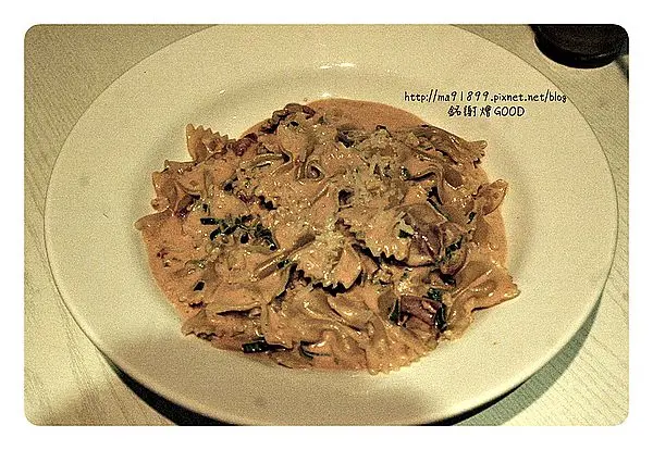 其實就是粉紅醬(番茄與油奶調和)佐蔥味香料,比較特別的就是兼具軟與Q彈口感的蝴蝶麵這樣