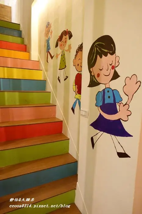 樓梯很繽紛,牆面上也有可愛的塗鴉
