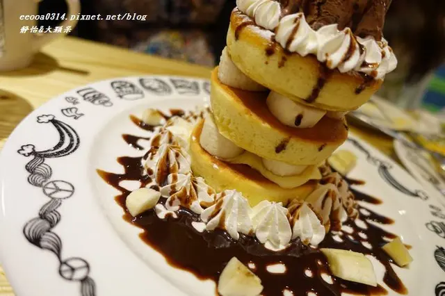 這一盤就是一層鬆餅一層香蕉一層鬆餅一層香蕉這樣