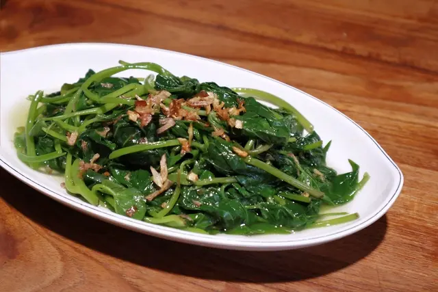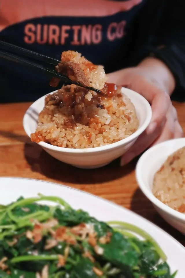 地瓜葉清燙後灑上些油蔥與醬油,多了些鹹香蔥香味,滑嫩帶脆。