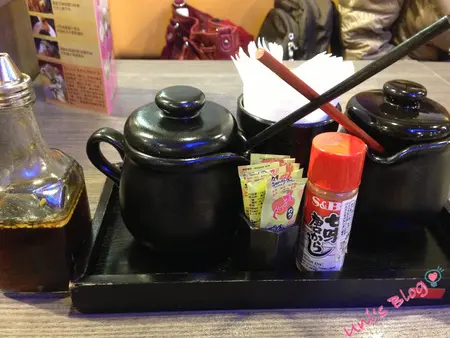 桌上有附醬料 紅湯匙的辣的豬排醬 黑的則是甜醬