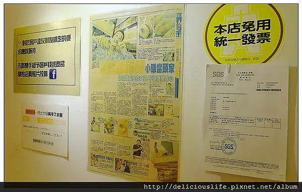牆壁上貼有報紙對店家的商品介紹~包括澱粉來源以及SGS檢驗證明!