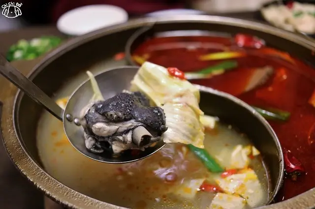 麻辣紅鍋涮幾下,海鱸魚軟嫩而吸附湯汁,非常好吃!