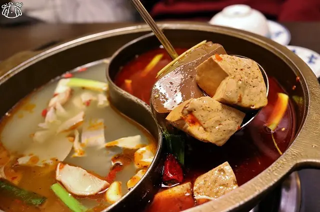 九寨十鍋的湯頭有紅鍋與白鍋兩種,湯底的鴨血、豆腐都是無限添加。