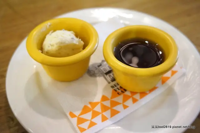 鬆餅單吃就有一點甜度,但這樣口感會偏乾,