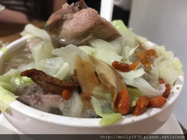 高麗菜的份量也給的很大器,補充足夠蔬菜的攝取量。現點現做的雞湯內牛蒡片跟湯一起熬煮,所以可以吃到有牛蒡味脆度又剛好的牛蒡。