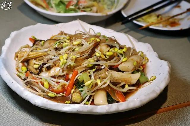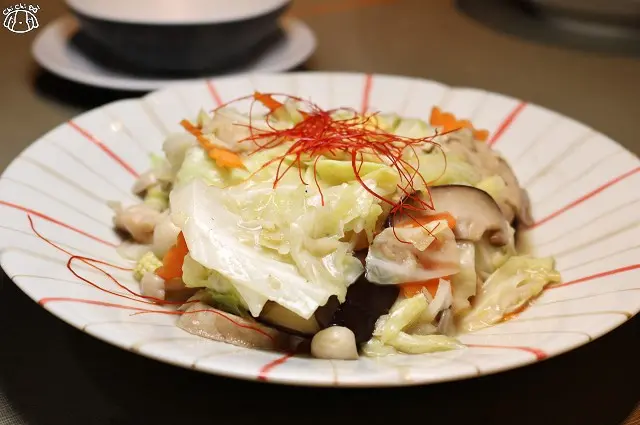 八道炒食蔬會依季節變化食材,有香菇、美白菇、玉米筍、花椰菜等等...