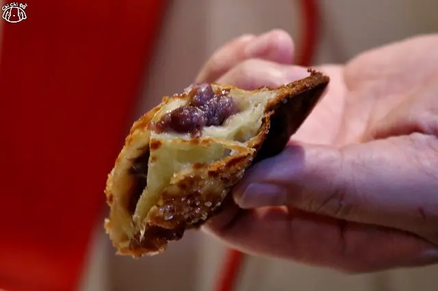 熱呼呼現點現做,灑了糖粒,紅豆甜度剛好。