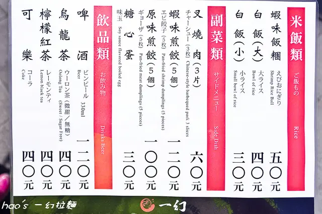 飯類提供蝦味飯糰50元及白飯,副菜類有原味煎餃100元、蝦味煎餃120元,