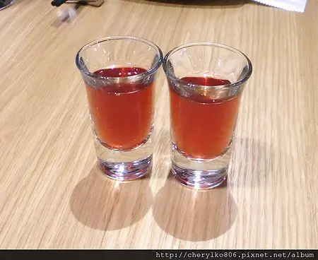 點餐完畢,服務生送來兩小杯冰涼紅艷的果醋,喝起來像是蔓越莓的味道。這果醋是可以一直續杯的,服務生會主動來添加,比起【川譜】來大方許多。