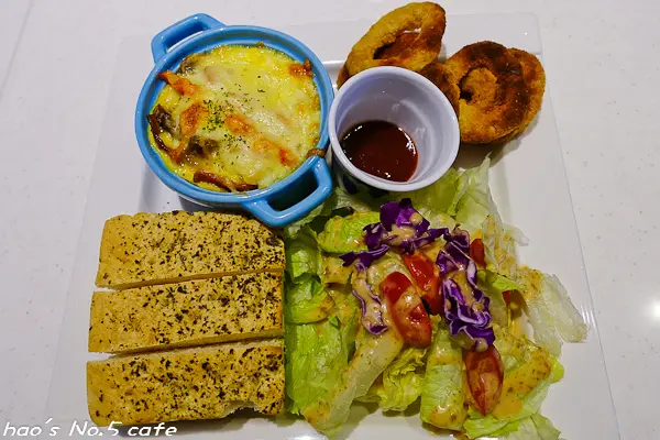 搭配汽炸鍋所炸出的洋蔥圈、麵包及清脆沙拉,份量恰到好處。
