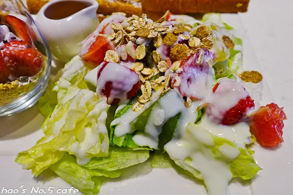 清脆的生菜搭配酸甜草莓,再淋上麥片及濃郁的優格醬。