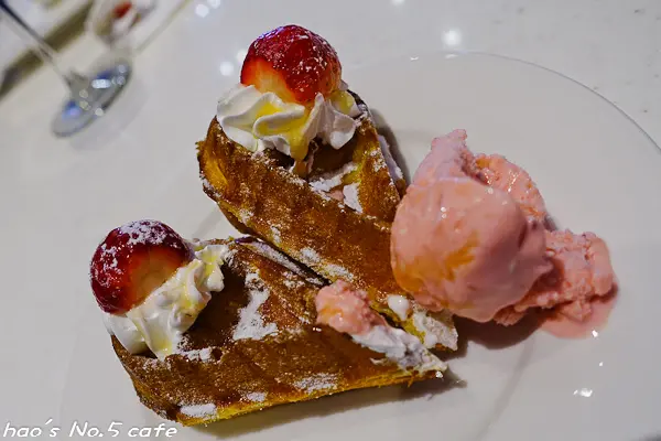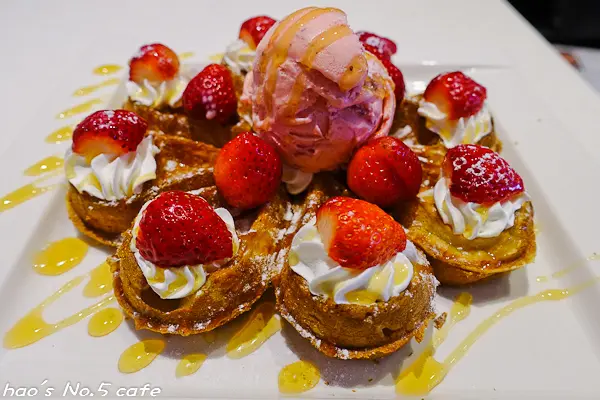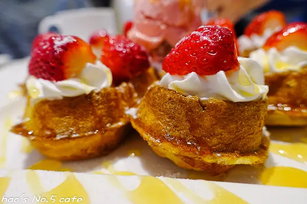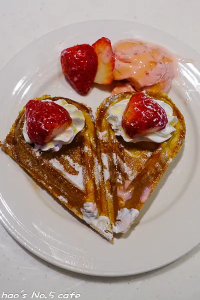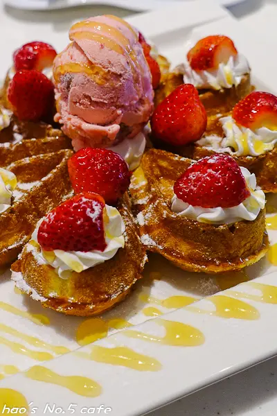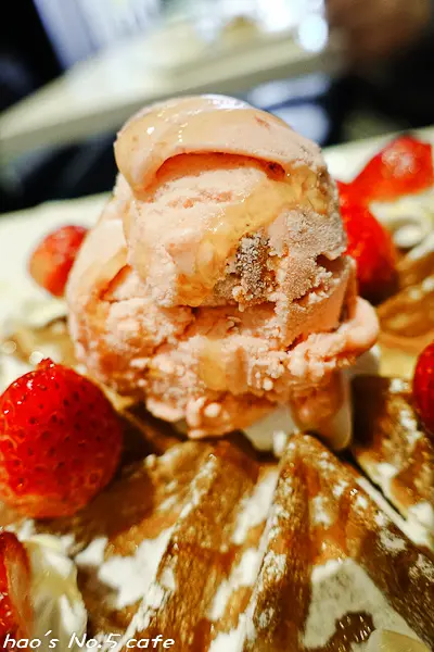 鬆餅呈現美麗的花型,搭配大量的新鮮草莓及粉色草莓冰淇淋,