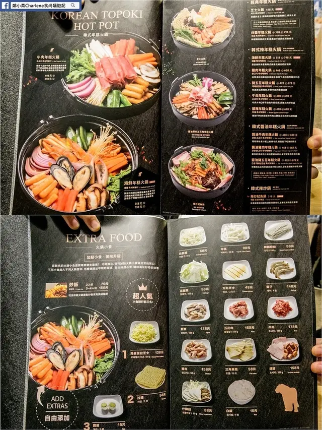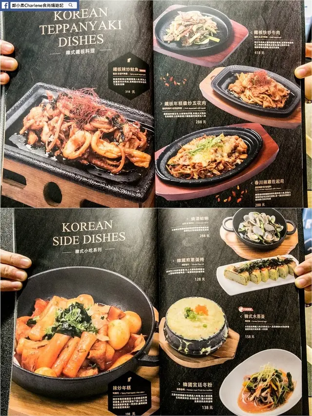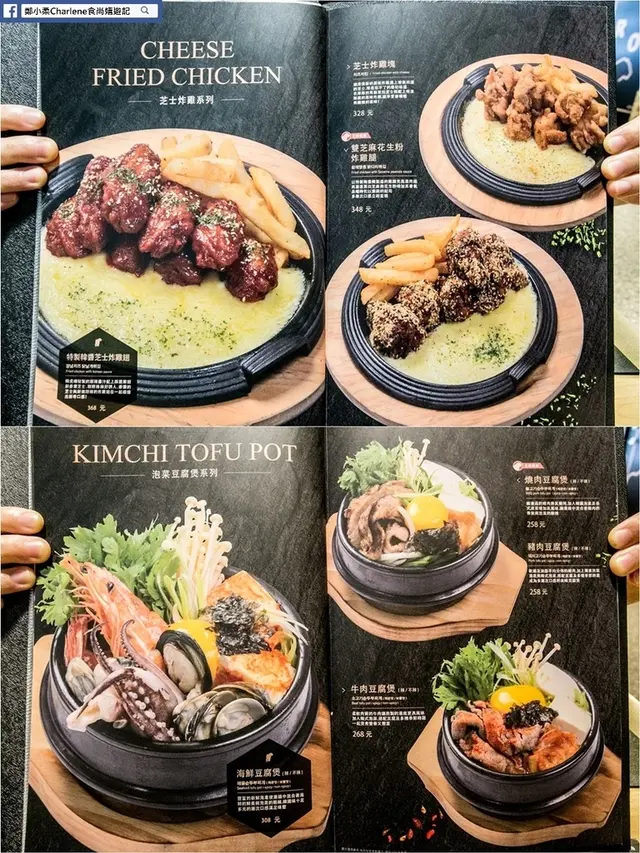 菜單主要販售餐點為:韓式年糕火鍋、炸雞、豆腐煲、韓式鐵板料理、