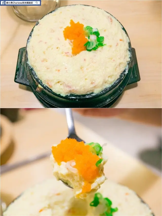 柔嫩蒸蛋裏頭有散蟹肉棒與蝦仁,上方由新鮮青蔥與鮮甜蝦卵點綴其中,