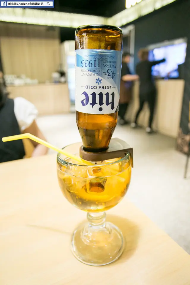 這道是人氣酒精性飲品,水蜜桃果味啤酒倒扣在玻璃杯上