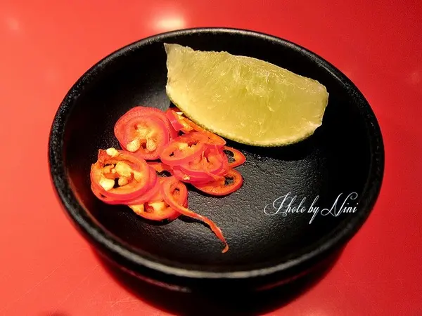 沙茶牛肉河粉會隨附上這盤生辣椒和檸檬片,加了才會讓湯頭更升級增添風味