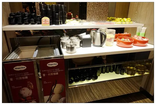 有哈根達支的兩款冰淇淋以及一些迎賓水果、餅乾~也有涼茶和檸檬水全都可自行取用