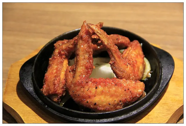 外酥脆內軟嫩的炸雞翅鹹香開胃~底下有生菜可以搭配著一起入口