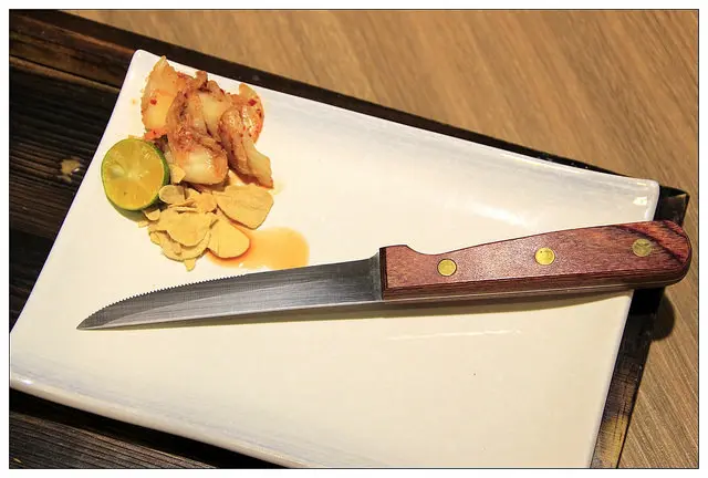 一旁附上切豬肋排的專用刀~還有泡菜/蒜片/金桔等配料