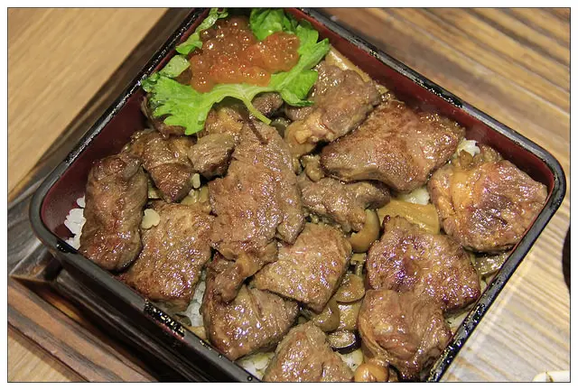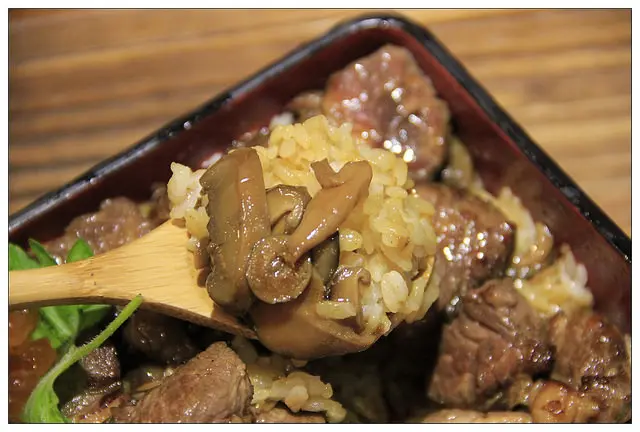 讓人驚喜的是在牛肉和白飯的夾層中藏有調味過的菇類