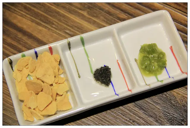一旁會附上配料~從右至左分別為芥末醬 松露 蒜片
