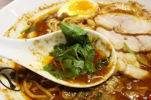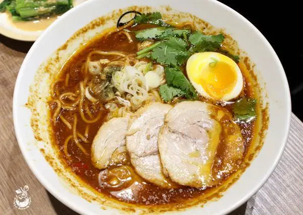 ▲辛十二香拉麵運用5種味噌和10多種辛香料,並灑上台灣人常用的香菜來挑起食慾 。辛香料的香氣和味道太過強烈,湯頭喝不出明顯的豚骨味,個人覺得有點類似在喝咖哩湯的感覺,稍微有辣度但不至於過辣讓人不適(只是對我這種很能吃辣的人來說是無感等級的辣)
